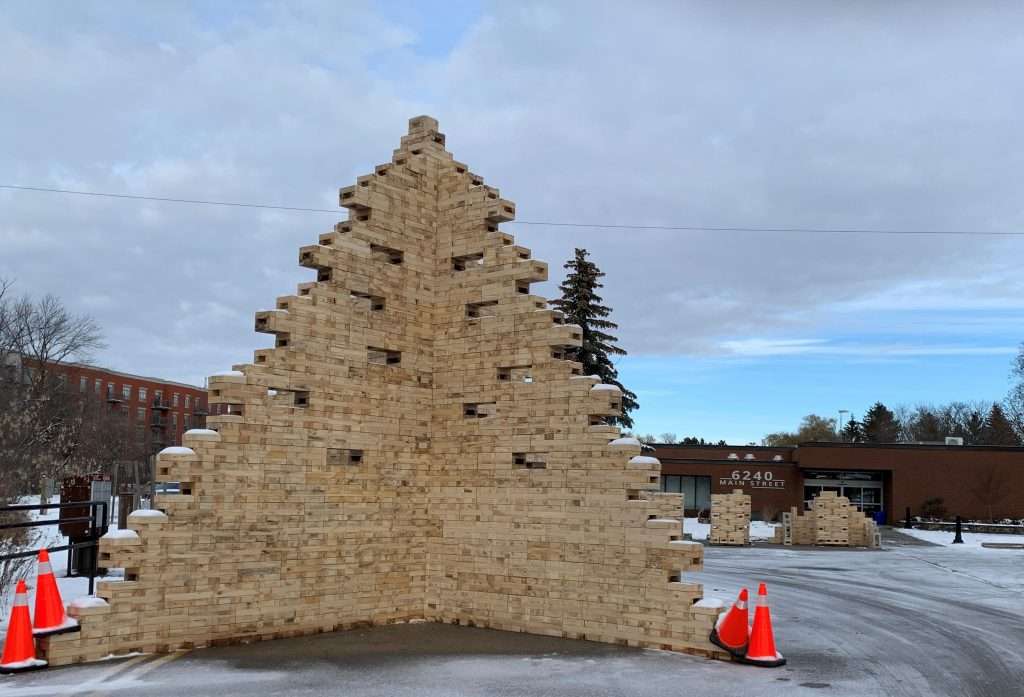 The Stouffville Holiday Market’s GRIPBlock structures include booths for local stores and restaurants, gathering areas, seating, a stage, and enormous Christmas Trees all built from the wooden blocks.